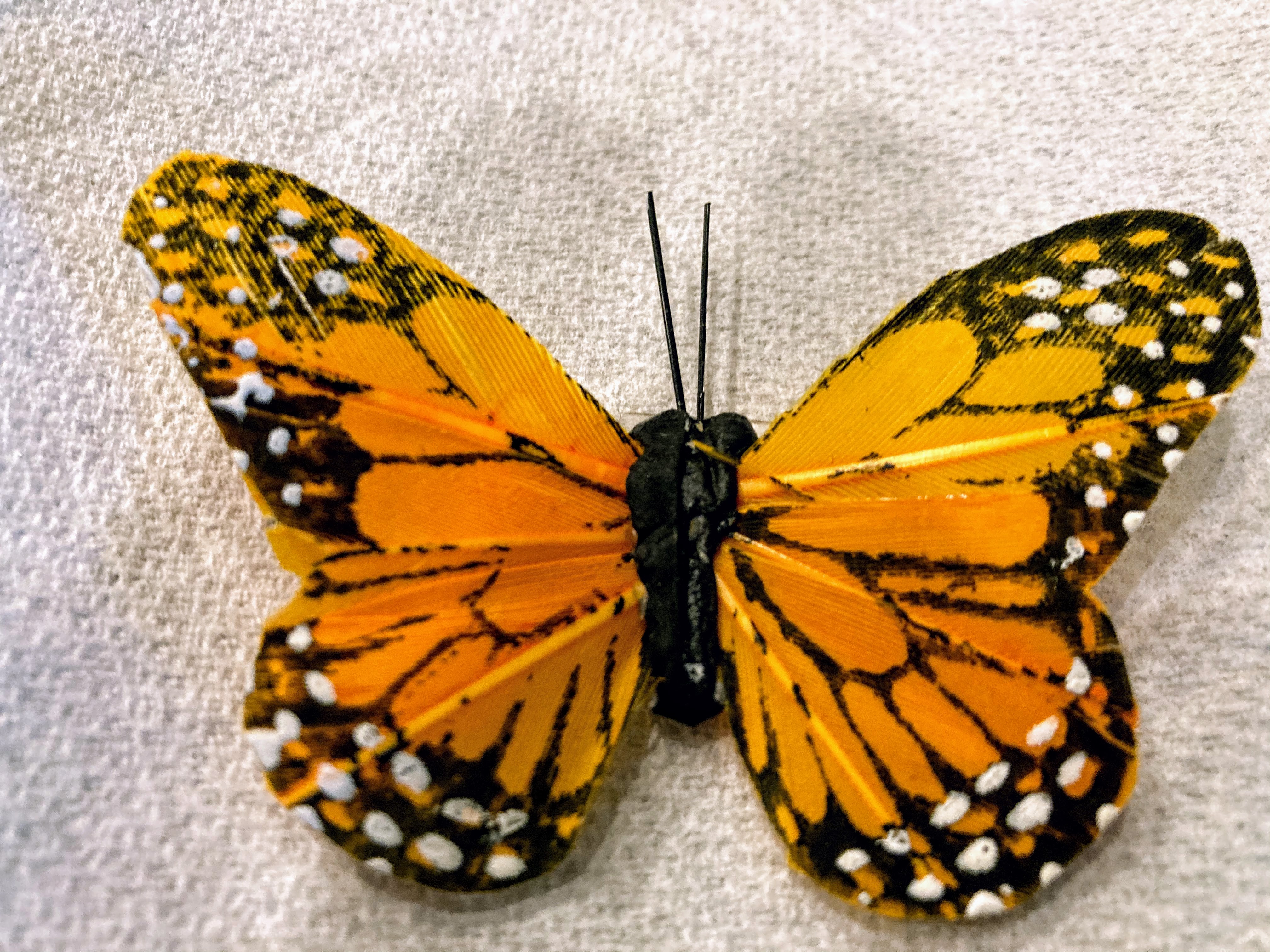 Ok, I was willing to accept that this wasn’t an ethereal visit from Megan. But why was there a realistic-looking fake butterfly in my kitchen? I had never seen it before, and there are only two of us in the house. I gave up a Purgatorial visit and decided we had a ghost. So I sent a photo, and my thoughts, to my sister Jen.