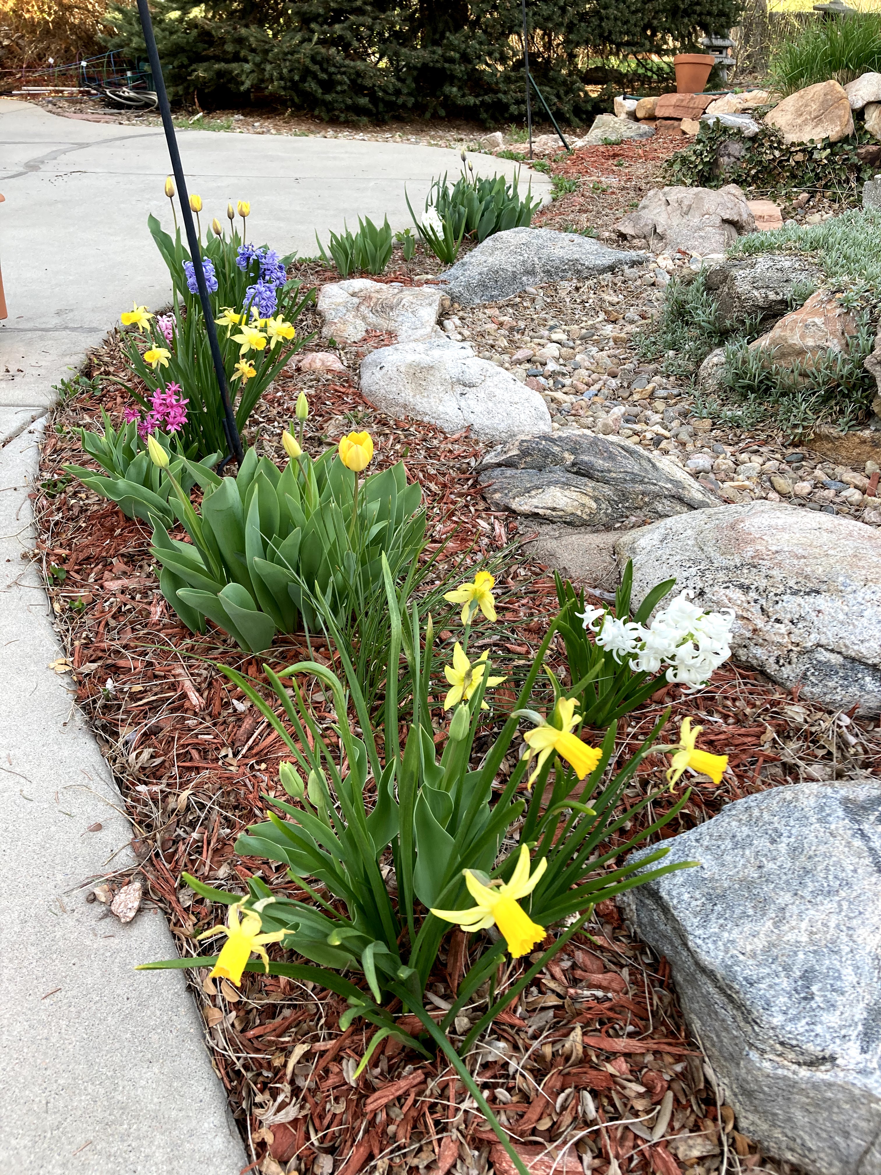This, my friends, is what my garden looked like the day we got back to Denver from our time in AZ. In the past, we have come just a few days too late. This year, despite the fact that we came at the same time, spring had sprung. I kid you not, the next day they were already wilting and fading.