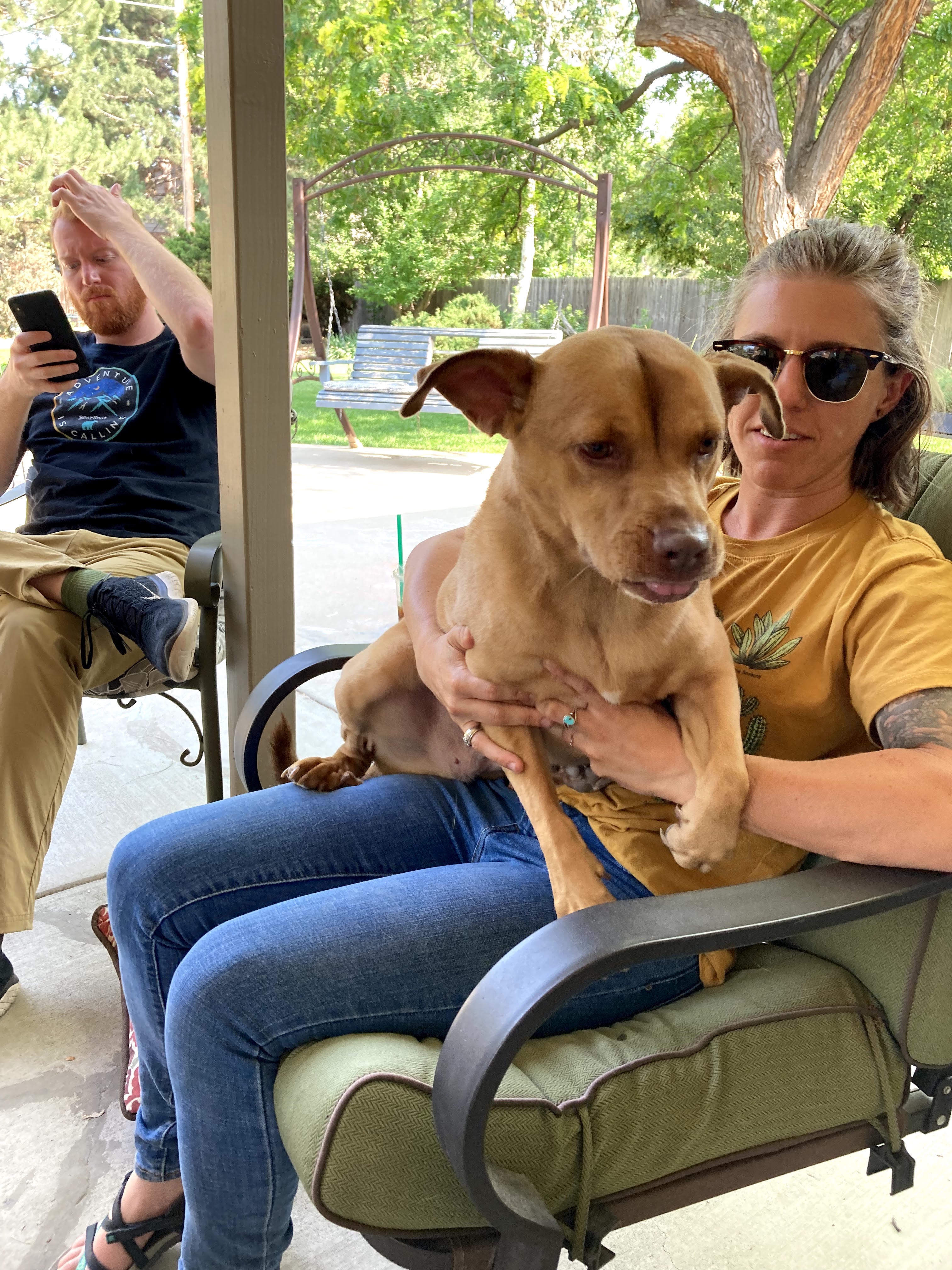 Dave’s daughter Jessie and her boyfriend Robert have two dogs — one apiece when they met. Both are adopted and are mixed breed. Well, to be honest, it’s not exactly accurate to say Jessie adopted Edi. It’s more accurate to say Edi adopted Jessie. She was a junkyard dog, literally. Jessie took her home, fattened her up, and Edi is about the most loyal dog I’ve ever seen. She is part pit bull and part sharpei. Mostly, she thinks she’s a lap dog…..