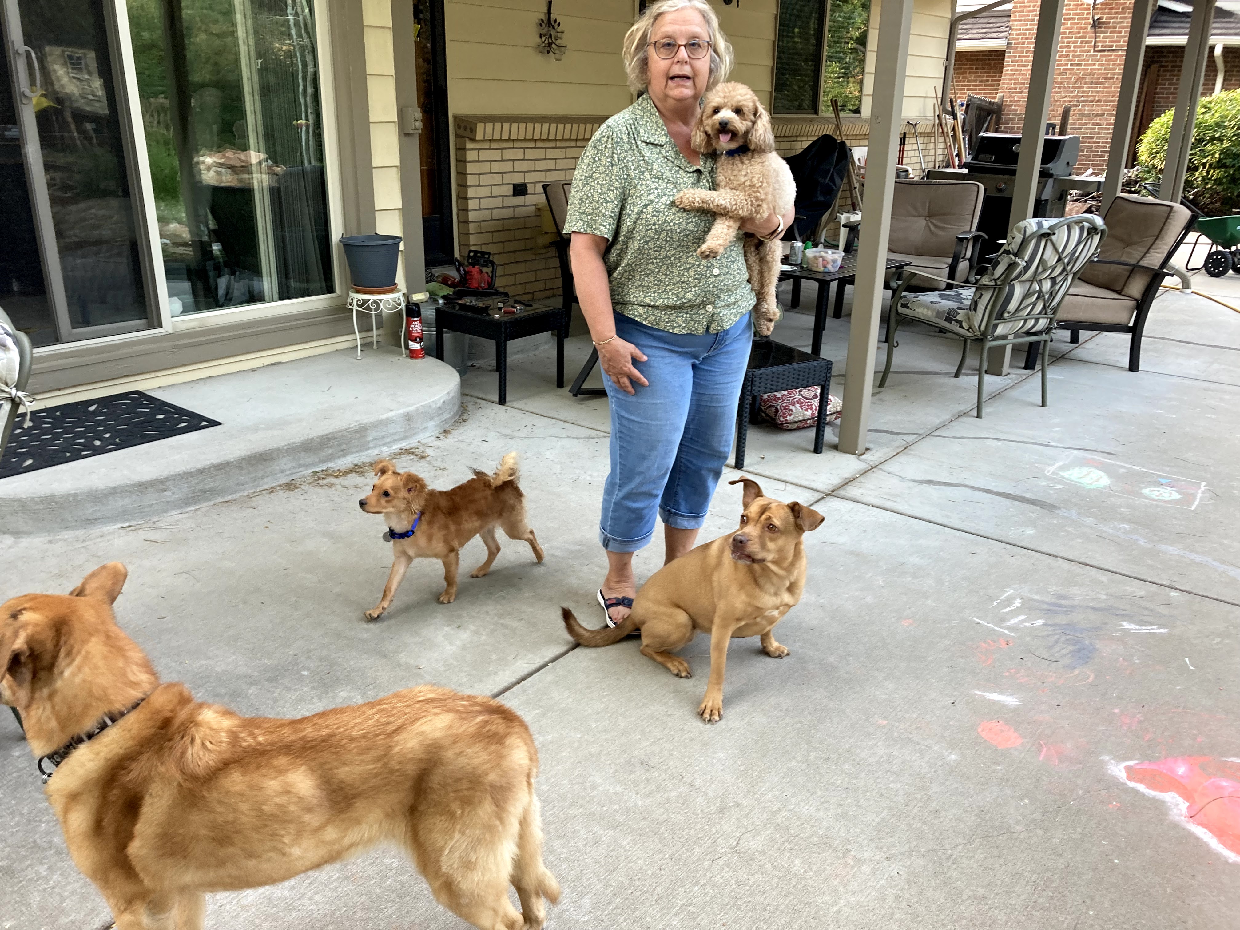 Ali is the matriarch and watches the other dogs romp like the elderly aunt watches her great grand nieces and nephews at play. Winston, of course, is Jen’s dog. He wasn’t sure what to think about this particular pack, and so he sort of sat on the sidelines and watched. I tried to get a photo of all four dogs, but this is the best I could do…..
