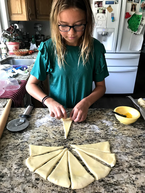 When we returned, some hour-and-a-half later, the bread was doubled in bulk and ready to be rolled. This was the point at which Dagny took control. She divieded the dough in half and rolled one half into a circle. Modeling her Aunt Lauren, she then cut the dough into triangles, and rolled the triangles into perfect crescent shapes…..