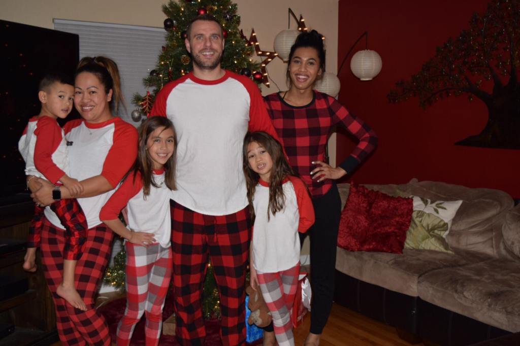 Anyhoo, we were driving down one of Mesa’s main thoroughfares on the way to Costco when I noticed something quite odd. There was a man who appeared to be of Baby Boomer age, perhaps on the young side. Maybe in his early 60s. He was cheerfully walking down the street. What was odd was that he was wearing flannel pajamas. I’m not talking those flannel pajama bottoms that young people call grocery store and airline flight clothing. I’m talking red and black plaid pajama bottoms and a matching pajama top. In fact, in order to give you an idea of how odd it was, I’m going to share a photo of my son Court’s family a few Christmases ago. This photo isn’t odd, because, see above: It was Christmas…..