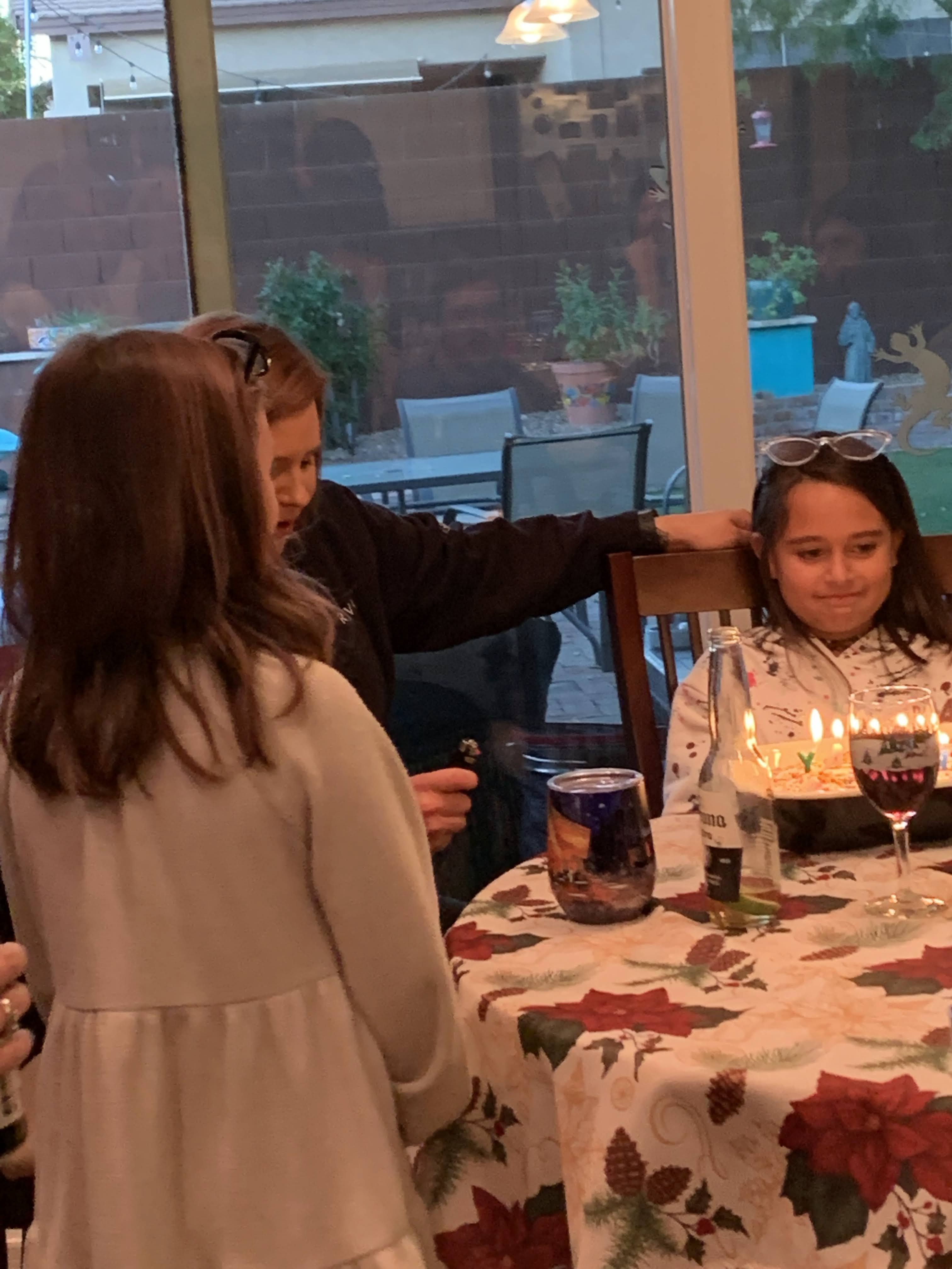 Of course, for this family, New Year’s Day means something else as well. One of Zoe’s big sisters — Lexie — turned 9 on January 1. She will grow up assuming everyone has a massive party with a gigantic prime rib for their birthdays. Oh, and fireworks, which her Great-Aunt Jen always contributes. I have decided that one of the most embarrassing moments of our life is when the candles are lit and the dreaded birthday song is sung. Could she look more embarrassed?…..