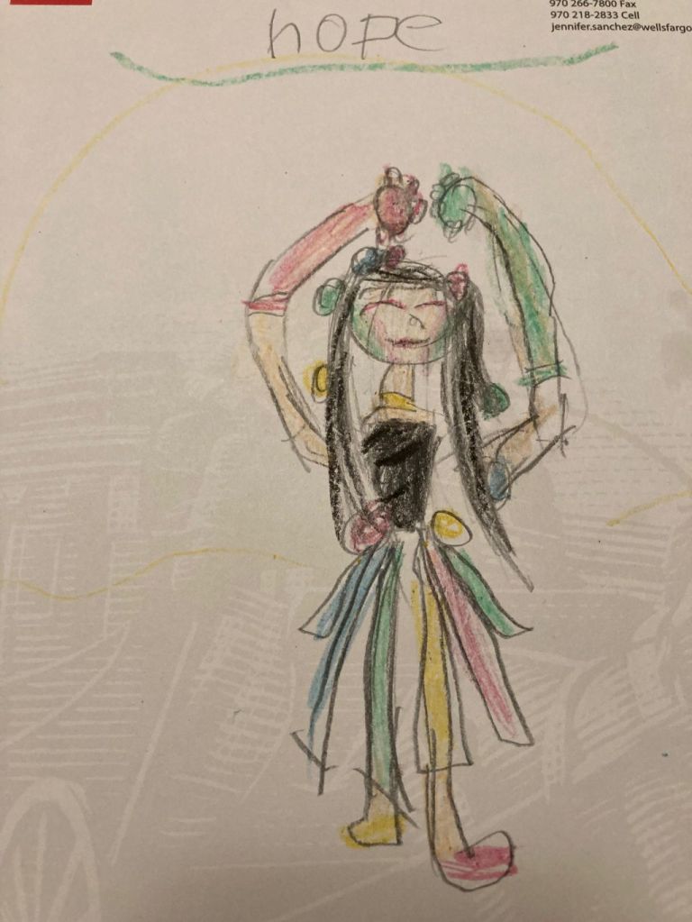 As I said earlier, I was proud of the girls. But I was also struck at how intently 7-year-old Cole watched the stories, and even more so, how much he talked about them after. The next day he spent time with me, and he asked questions and talked about the stories endlessly. He was especially taken with the story of Pandora’s Box. In this particular presentation, the character of Hope was portrayed by a young girl who performed a ballet dance. It made such an impression on Cole that he drew me this picture of Hope….