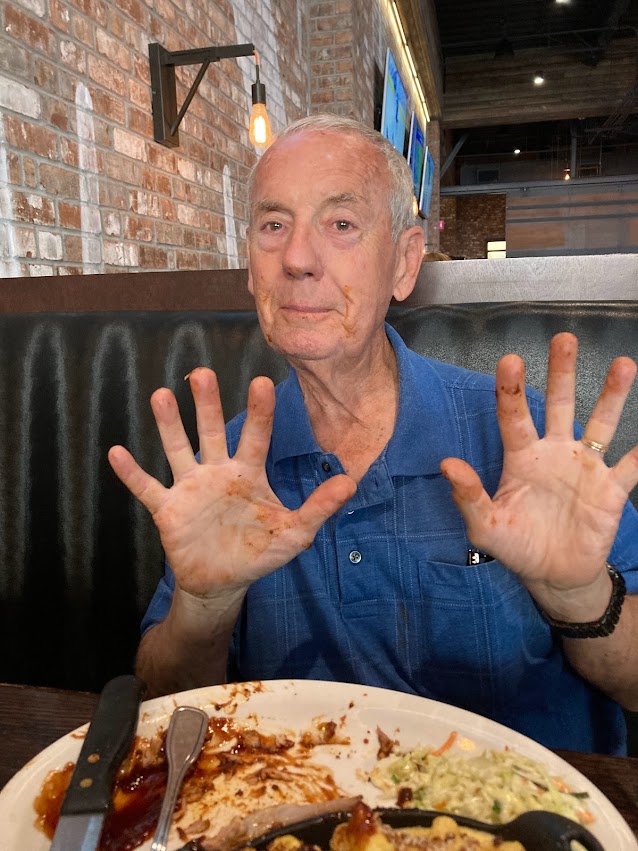 Last weekend, when Bill and I went downtown and pretended we were grownups, we ate dinner at a restaurant called Henry’s Tavern. Bill ordered barbecued ribs and very quickly proved he definitely was NOT a grown up. it didn’t take long before he was covered almost from head to toe with barbecue sauce…..