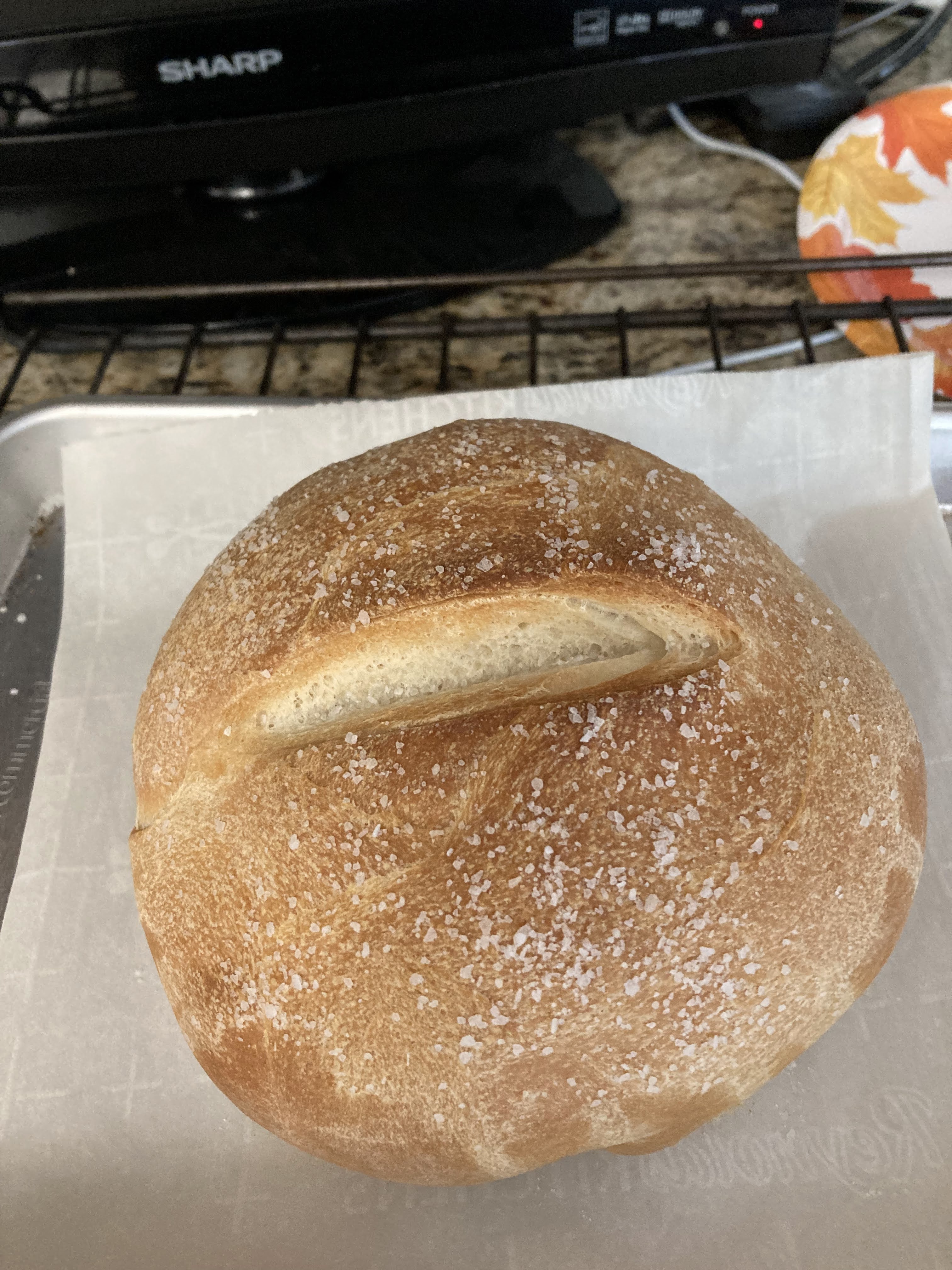 Crusty on the outside and soft and tender on the inside. Though you can’t tell in the photo, it’s a very small loaf, just enough for two meals for Bill and me. I baked it using my new quarter-sheet pan. Bigger isn’t always better.