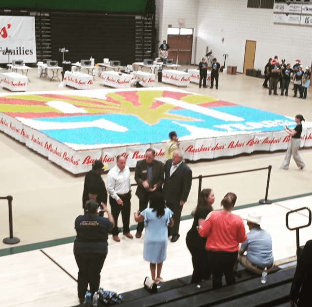 Basha’s Grocery Store — where my brother works — is celebrating its 90th anniversary. To commemorate this landmark anniversary, they decided to break the Guinness world record for the most donuts used to create a motif. A total of 14,400 donuts were filled, iced, and appropriately placed to create Basha’s logo…..
