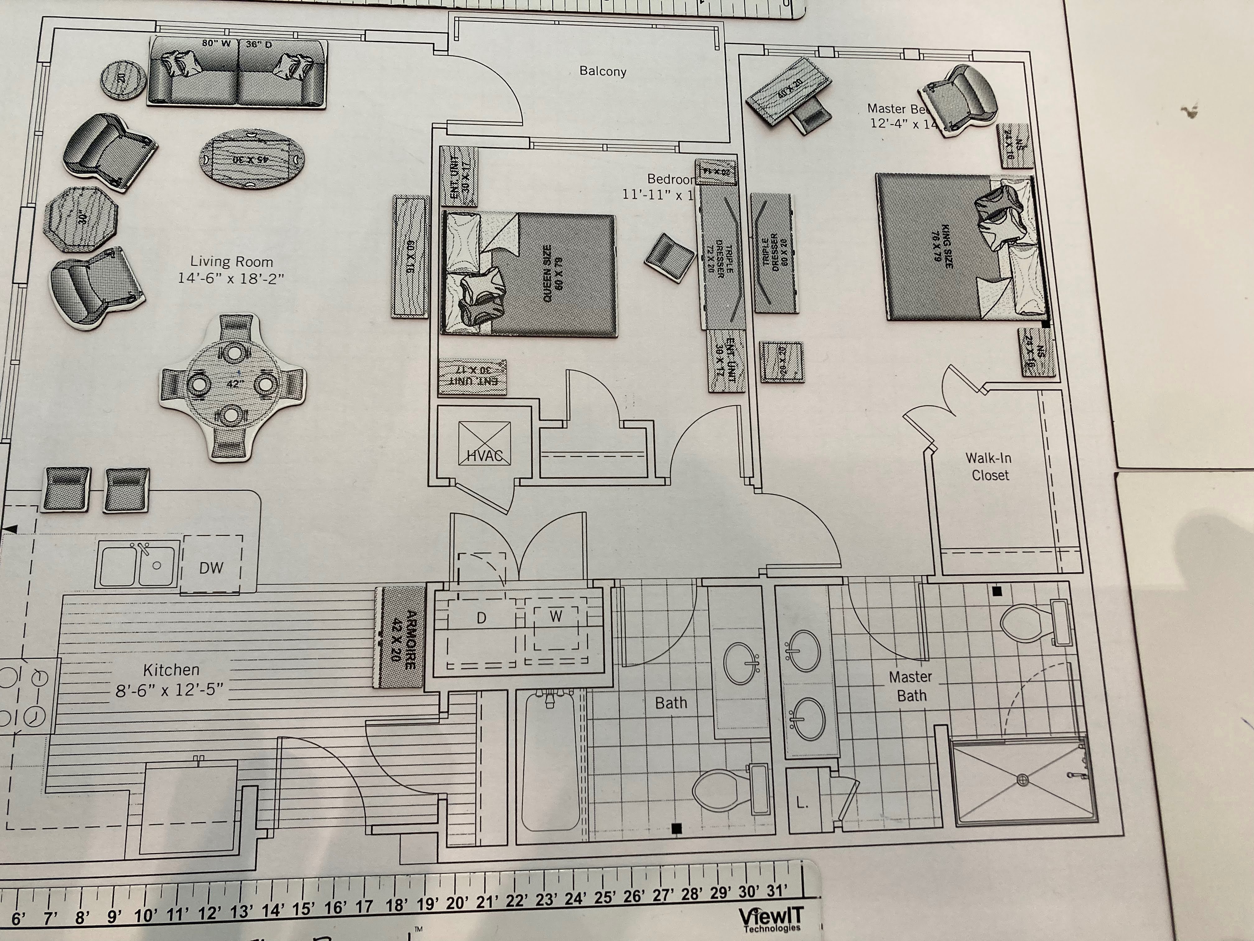 When we were finished with the chore, she brought out of her magic moving consultant kit a big piece of paper that was our floor plan. She also brought out a magnetic board and a board that contained what seemed like 200 magnetic pieces representing furniture. We then sat together and decided whether our furniture dreams were realistic, and, if so, how to make that happen…..