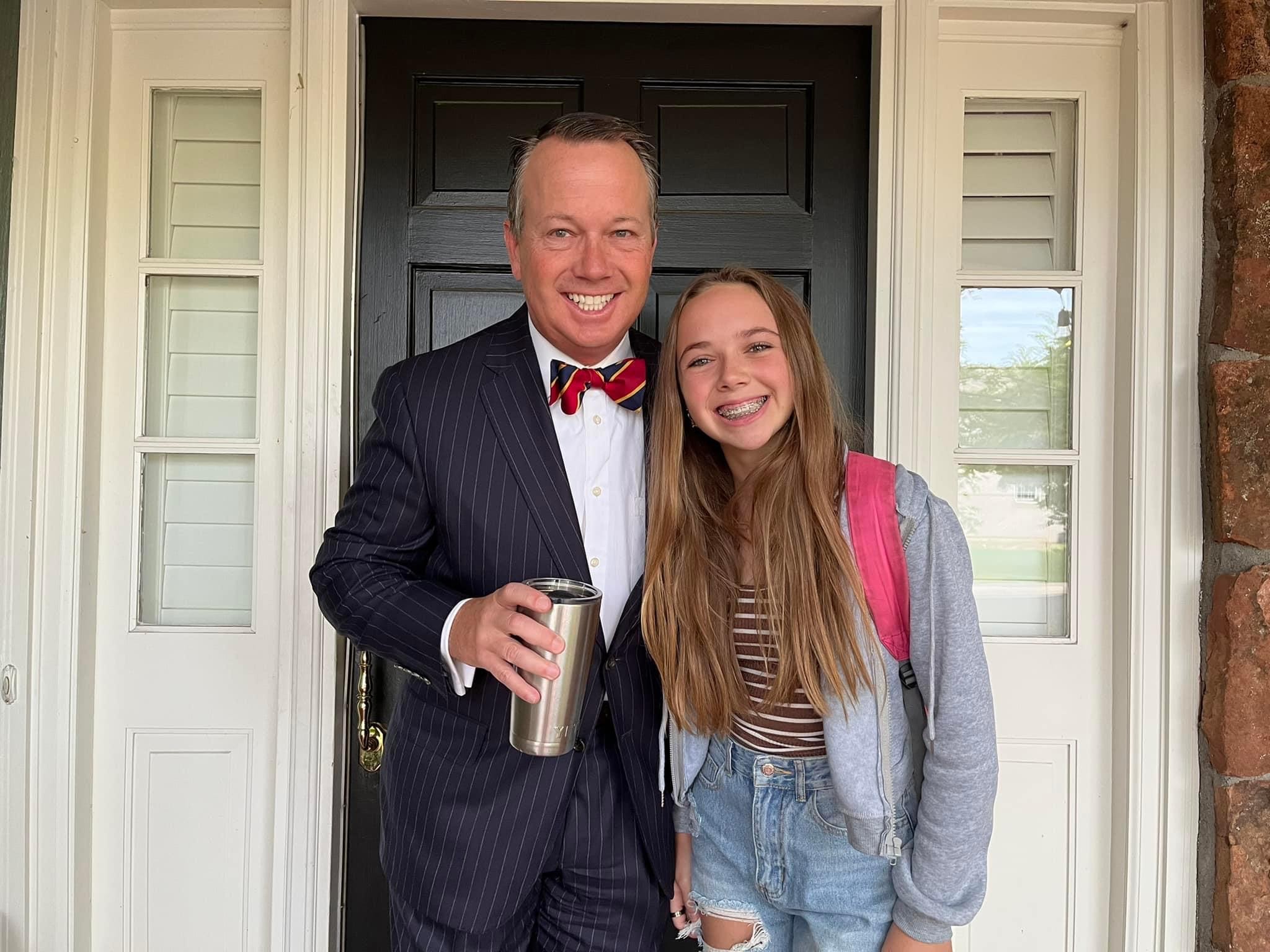 I mentioned before that, with the arrival of Maggie Faith, the nearby high school now includes not 1, not 2, but THREE McLains. I asked their mother how things were going. She said that Maggie told her she passed both Dagny and Alastair in the hallway one day this week, and got no hint of recognition. I’m happy to say she seems to be settling in well. She made the volleyball team, so it will be fun to watch some of her games. Here she is on her first day, posing with her dad…..