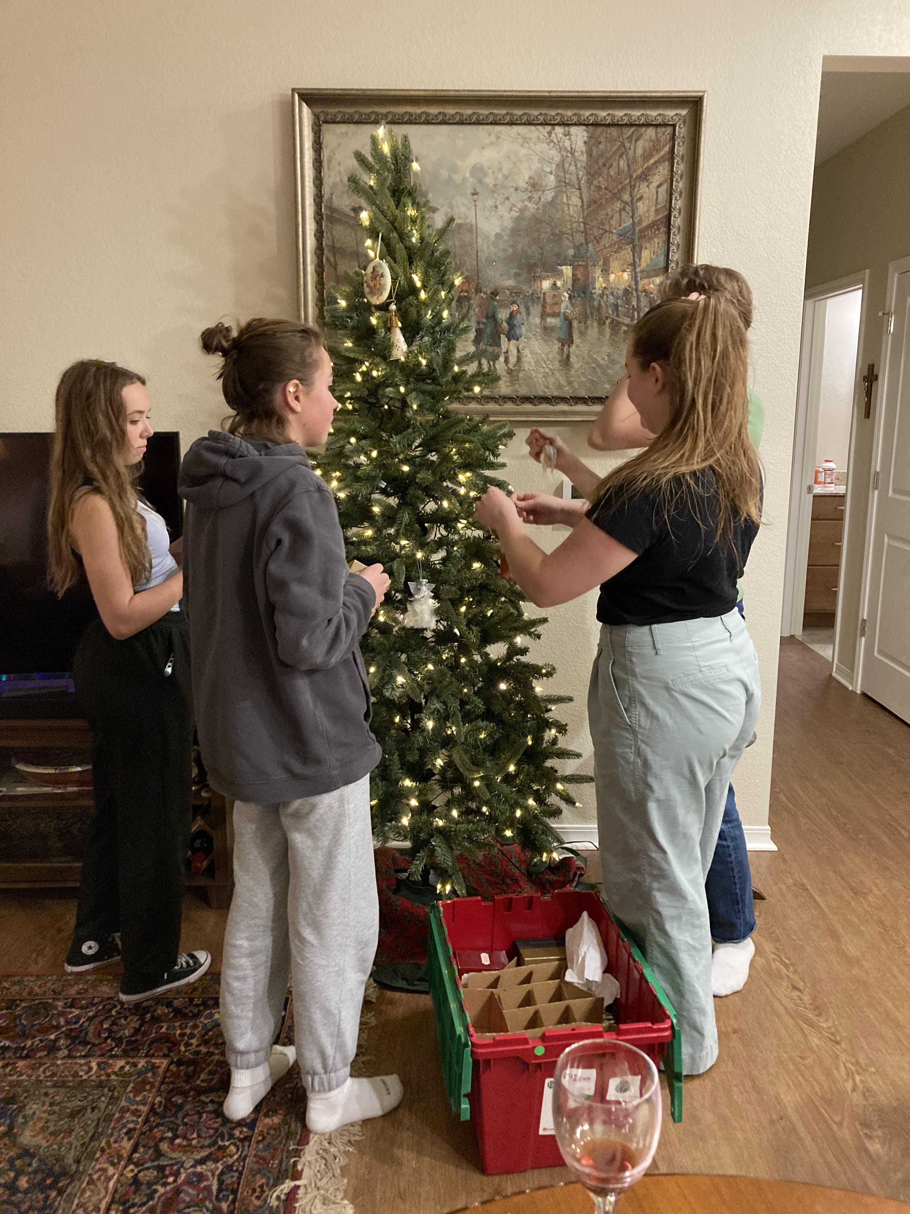 On Wednesday evening, three of our granddaughters and one boyfriend came for a visit. Adelaide and her boyfriend Palmer, Dagny, and Maggie Faith swam in our salt pool, and Bill and I joined them. We ate a dinner of lasagna and salad. But the highlight was that they decorated my angel tree. The whole evening and this precious time with my teenaged grandchildren made me a very happy nana.