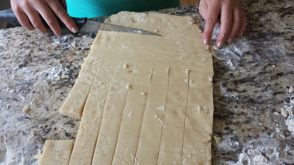 Nana’s Notes: This, unfortunately, is one of those recipes that really requires (or at least works MUCH better) with a large Kitchen Aid mixer. The dough simply doesn’t come together otherwise. Don’t let your dough chill more than 30 minutes because it becomes practically unworkable. Addie and I rolled the dough out into a rectangle, and then cut the cookies into squares. However, you could certainly use cookie cutters. One recipe I saw called for pressing the dough into a cake pan, cutting the dough like you would a scone into triangles, and then baking. After the cookies are baked, you would then have to again cut the cookies on the indent. Lots of options. By the way, if you don’t have a big mixer, give it a try with a smaller mixer. The dough likely won’t come together, but you could still press it into a cookie sheet. They won’t be quite as pretty, but hey, how can you go wrong when your recipe is butter and sugar and vanilla?