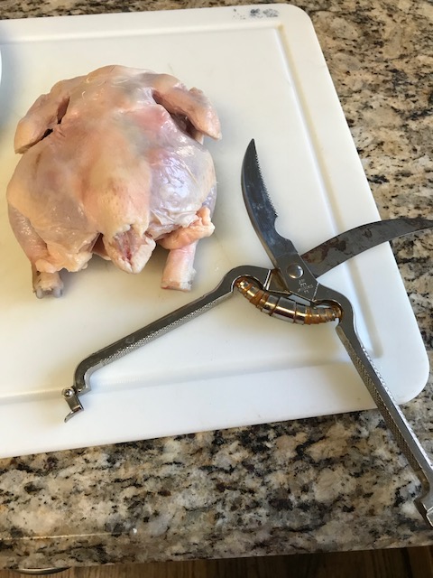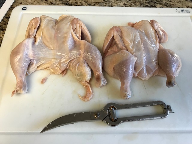 But back to spatchcocking, which is simply another word for butterflying. In other words, you use your kitchen shears or poultry shears and cut out the backbone of some kind of poultry, thereby allowing the bird to lie flat and roast or grill more quickly. The result is a crispier skin.