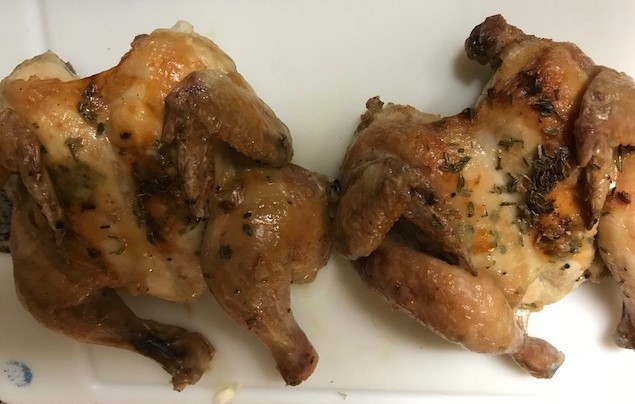 My mother used to make Cornish game hens. She did not spatchcock them. Instead, she stuffed them with wild rice, slathered them with butter, sprinkled on salt and pepper, and roasted them in the oven. They were heavenly.