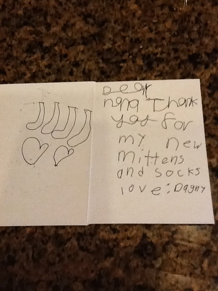 One more little side note/follow-up. Remember a couple of weeks ago when I bought my sweet little third-born granddaughter a pair of pink mittens and pink ski socks to make up for the fact that she was having to wear her brother’s hand-me-down ski coat? Well, today I got this in the mail. So sweet. I particularly like the illustrations of the mittens and socks. It’s a remarkable resemblance.