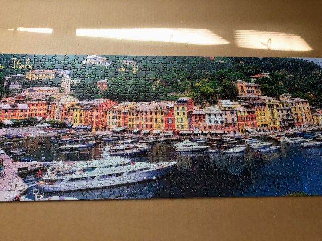 Bill has not had very many projects during our entire time in AZ this season. And let me tell you, the man does not like to be bored. So maybe four or five weeks ago, he went to our closet and pulled out a puzzle that had been sitting there for several years unopened. The reason it was unopened was that it simply looked too flipping difficult to me. I absolutely love puzzles, but I don’t want them to be so challenging that it takes forever between finding pieces that fit. So while I started out helping him – in fact, I did a lot of the border – I soon lost interest. He plowed on, however. He spent literally hours over that puzzle, which was a beautiful picture of Portofino, Italy. Finally, Tuesday evening, he let out a yelp. Done! It is pretty, but soon will be taken apart, put away in the box, and sent to Goodwill for some other sap to work on….