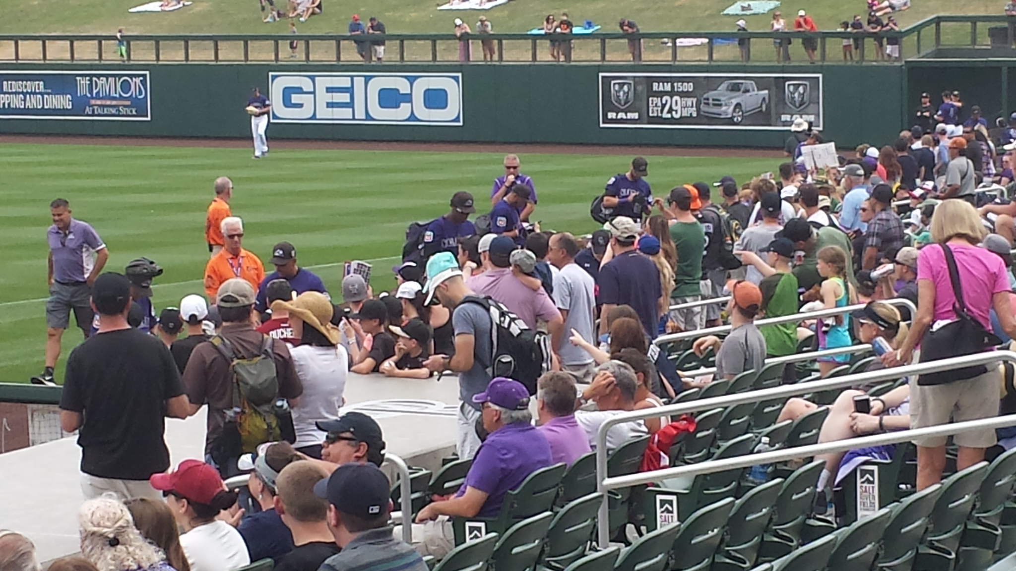 Yesterday we attended what will be one of the final spring games for the Colorado Rockies at Salt River Field in Scottsdale. They played the White Sox, and unlike the Cubs’ game, the stands were far from full. Having not attended another Rockies game this spring, I don’t know if that is typical, or if the fans have simply run out of steam. The weather was overcast and delightfully cool. But given the weather and the only halfway-full park, the beer venders were begging for sales. Even the man with the hat that makes it look like there’s an arrow going through his head and wearing peanut earrings was desperate to sell a beer or two.