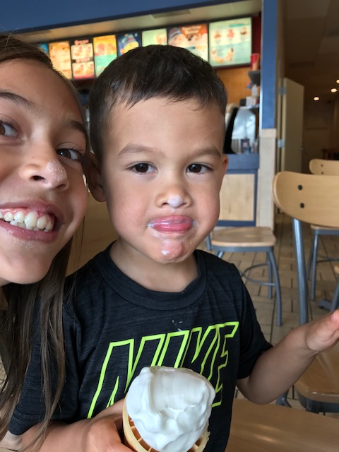 The other day I was tired of listening to all of the noise coming from the family room as Bill began installing the wood flooring, and decided to take Kaiya, Mylee, and Cole for an afternoon ice cream cone. It is the grandmother’s duty, after all, to ruin the kids’ appetites. As we drove over to Dairy Queen, I asked the kids what they wanted. Vanilla cones dipped in chocolate for Mylee and Cole, and a vanilla cone with sprinkles for Kaiya. Before I ordered, I confirmed with Cole that he wanted a chocolate dipped cone, and he was firm about it. The reason I asked was because the last time I had taken them, that’s what I’d ordered him at his request. He was happy with it until he spotted Kaiya’s sprinkles and wanted them instead. Kaiya, who can’t tell her brother no, gave it to him happily. So this time, I wanted to make sure he wanted a chocolate dipped cone. This time he ate the chocolate off the cone, but once that was gone, he began pouring Kaiya’s unused sprinkles onto his then-vanilla cone…..