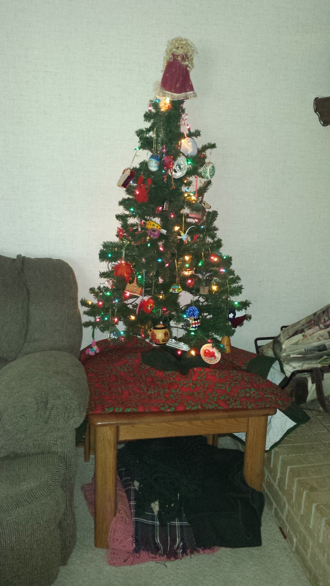 But the real answer, I think, is that we just need to consciously make our holiday simpler. In the past few days, I have mentioned my angel tree that we keep in our living room in front of the window. For years, I also put up a Christmas tree in our family room with all the ornaments I collected over the years. A few years ago, I decided that was too much work because we take down all of our Christmas decorations on Christmas Eve so our house is neutralized before we leave for AZ on Christmas Day. But last year, I decided that I missed those lights in the room in which we actually spend time, so I went out and bought a little tabletop tree. I can put it up myself in about a minute-and-a-half. It makes me very happy as I put on my favorite ornaments that I’ve collected over the years….