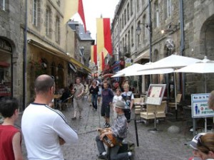 After we walked around the wall, we went into the town to look around. They were having some sort of festival, and we watched the children having races up the wall and different musicians and dancers performing. Bill had a delicious waffle, called a gaufrey maisson, with apricots. We then split a huge dish of moule marniere (mussels with leeks and wine), and some wine…..