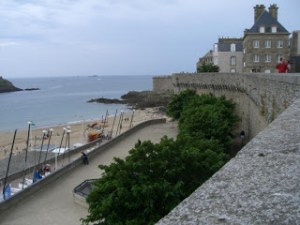 Following lunch, we checked into our hotel, and then went into the town of St. Malo for a visit. St. Malo has a very medieval feel to it, with the large wall surrounding the town. But the town sits on the banks of the Atlantic and is the most popular of the Breton seaside resorts. The beaches were appealing, sandy and large. There are old forts out in the water just outside the walls. When the tide is right, it looks like you can just walk out to those forts. At one time, the town