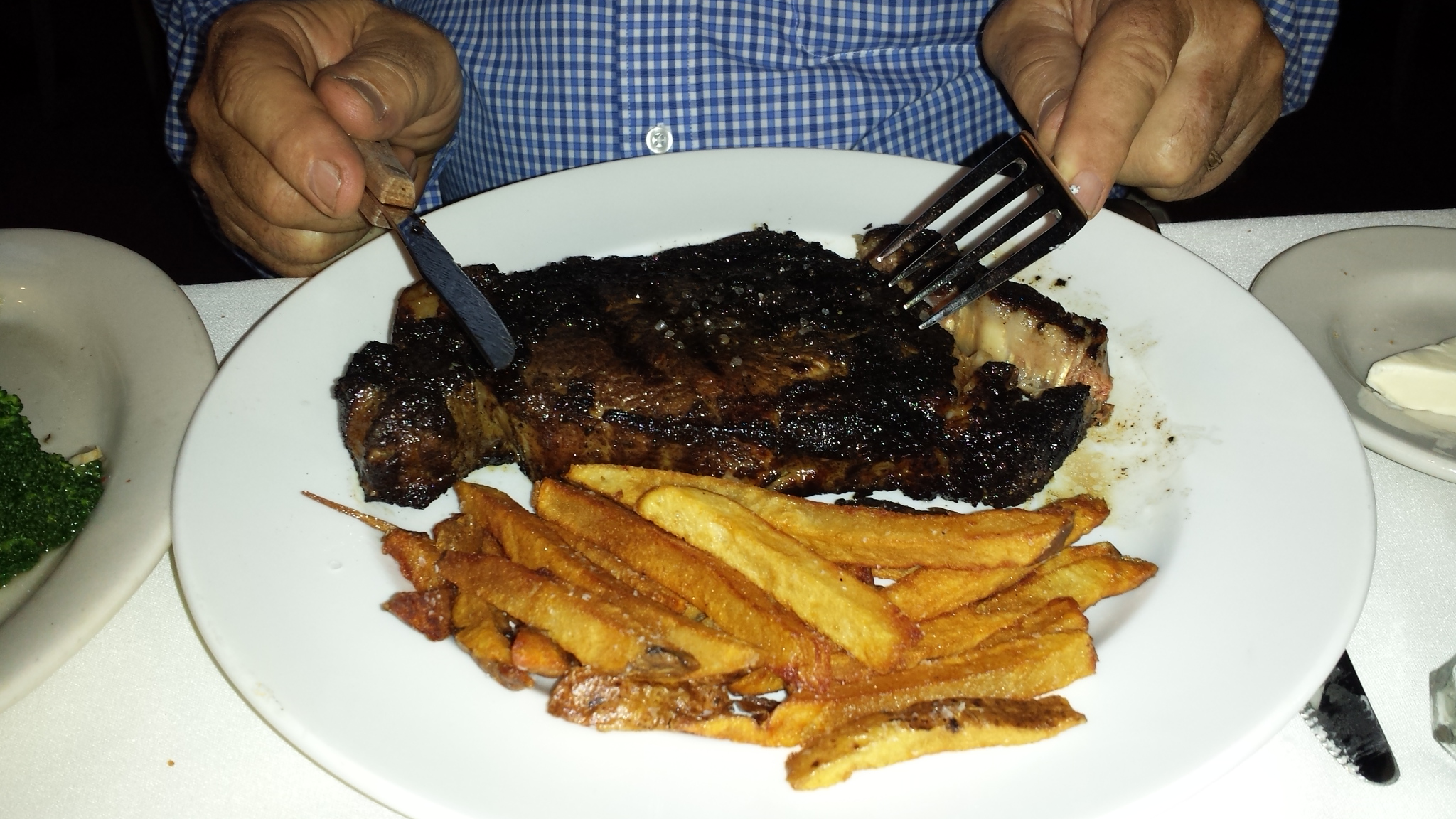 As we sat and ate our lasagna, Caesar salad, and French bread, we learned that Maggie’s husband Mark would also choose lasagna as his last meal. Funny, that. I like lasagna, but who would choose lasagna when you could choose a wonderfully dry and ice-cold Tanqueray martini, a perfectly-cooked bone-in ribeye steak with a dollop of herb and garlic butter, a crisp salad with a mixture of homemade Roquefort cheese dressing and the homemade Italian dressing made by my favorite childhood restaurant Husker House, and crème brulee with that crackly burnt-sugar topping?