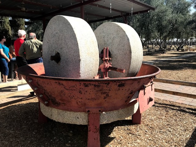 …..and a tour of the olive mill itself. Our tour guide explained that though this is what was used in years past to squish the olives (that is NOT a technical term),…..