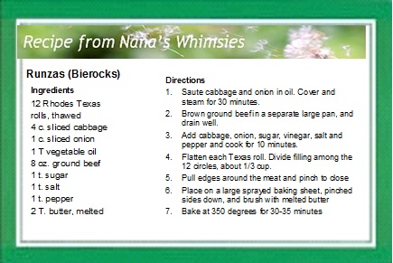 We got back from our family reunion in Nebraska late Tuesday afternoon. We were all very tired and pretty sluggish yesterday. It was about an eight-hour drive, but we had four drivers and took many breaks. One of our breaks was at the Runza Hut, a Nebraska fast-food restaurant chain. There are a few Runza Huts here in Colorado, but for some reason it would never even occur to me to eat at one. However, it is almost always a stop either going or coming on road trips to Nebraska. Runzas are bread wrapped around ground beef that is cooked with onions, cabbage, and spices. I’m always excited and optimistic, but equally always somewhat disappointed in the flavor. Still, it is a tried-and-true Nebraska treat….