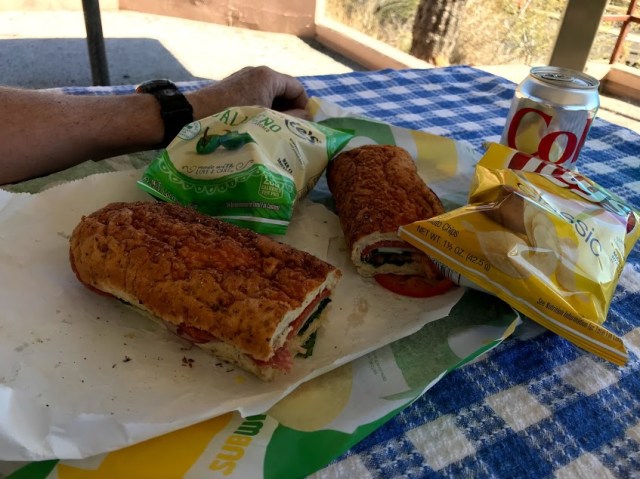 We decided we would go to Saguaro Lake, about 15 miles or so from our house. It is a beautiful drive and the lake is lovely – sparkling like blue glass. But first we would stop at the Subway that is in our neighborhood shopping center and pick up a sandwich to eat at one of the picnic table overlooking the lake.