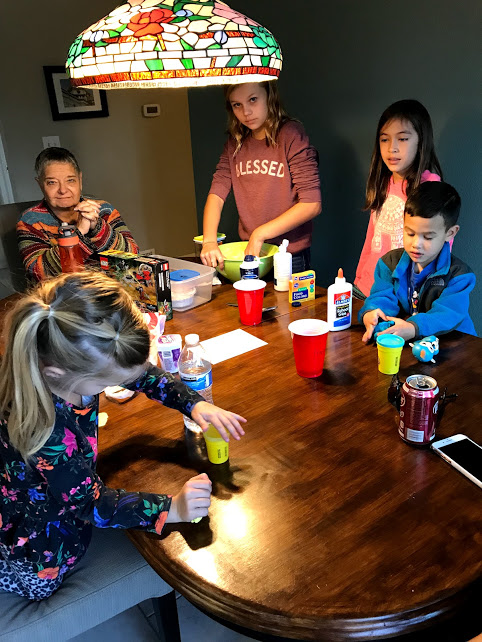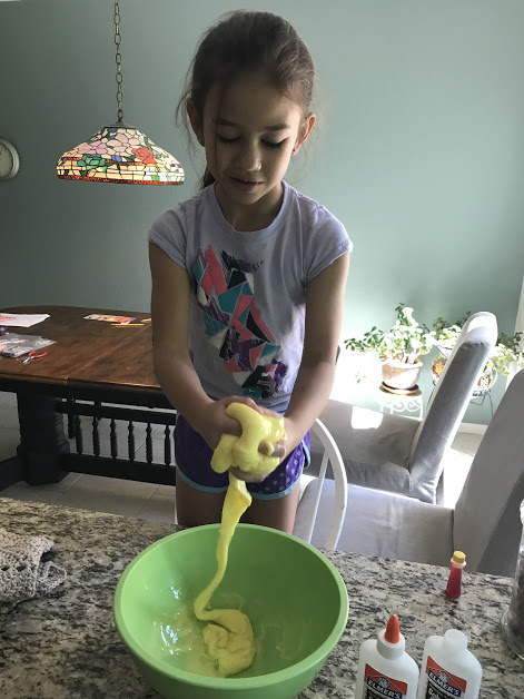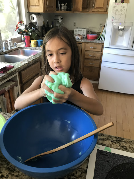 I’ve written about slime on a number of occasions. Just about every time Kaiya, Mylee, and Cole come for the day, slime happens. Dagny (who, by the way, turns 12 today) is a slime connoisseur as well. The purpose of slime rather eludes me. Play Doh I understand. I have seen my grandkids make amazingly intricate replicas of Play Doh food, or realistic-looking superheroes out of Play Doh. But slime? You just keep kneading it. Stress relief, according to Dagny and Kaiya.