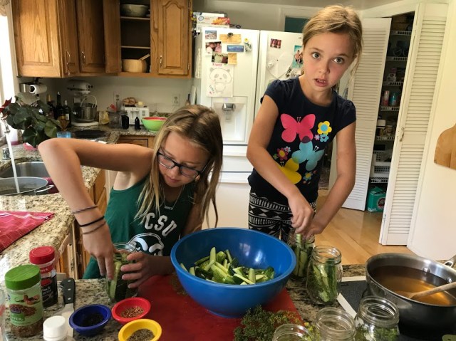 Bill brought up my canning equipment from the basement, and I washed the pickling cukes. About that time, Alastair, Dagny, and Maggie Faith arrived. How in the world do you make pickles? Maggie asked. She didn’t even realize that pickles came from cucumbers. I put them to work cutting up the cucumbers, which they did without slicing nary a finger. I then had them drop into each of six pint jars: a garlic clove, a finger full of dill seed, a sprig of fresh dill, a pinch of red pepper flakes, and a good pinch of black peppercorns. In the meantime, I prepared the brine, which consisted of apple cider vinegar, salt, and a touch of sugar. Dagny tasted it and proclaimed it to be perfect. In fact, I finally had to stop her from just drinking the brine as I was fearful it would make her sick.