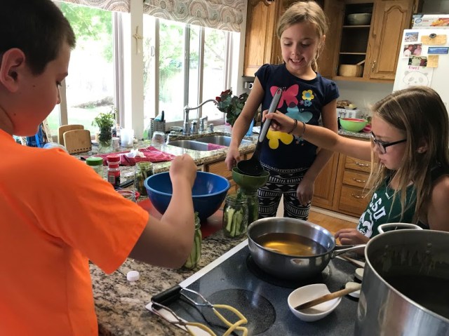 Sometime during Sunday night, it occurred to me that I needed to begin passing along my canning knowledge to my grandkids. So yesterday morning, I sent a text message to Jll asking if any of the kids would be interested in watching/helping me make pickles. Yep, she responded.