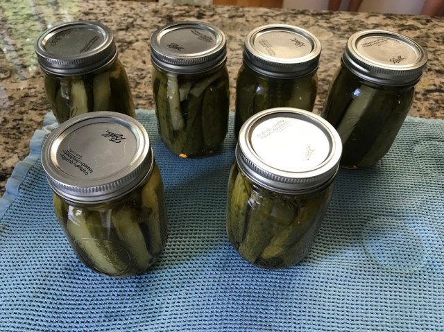 I don’t know how I learned to can. I guess I taught myself. But I learned to love pickles from both sides of my family. Every year when the pickling cucumbers were available, Mom would prepare a batch of her three-day dill pickles. These pickles were not designed to be processed and saved. They were meant to be prepared, kept in the brine for three days, and then eaten. Unfortunately, the pickles never lasted three days. By that first night, you could see one of us (usually Dad was the first) reaching under the plate that held the cucumbers down into the brine, weighted down by a large can of tomatoes or pork n’ beans. The pickles were long gone by Day Three.