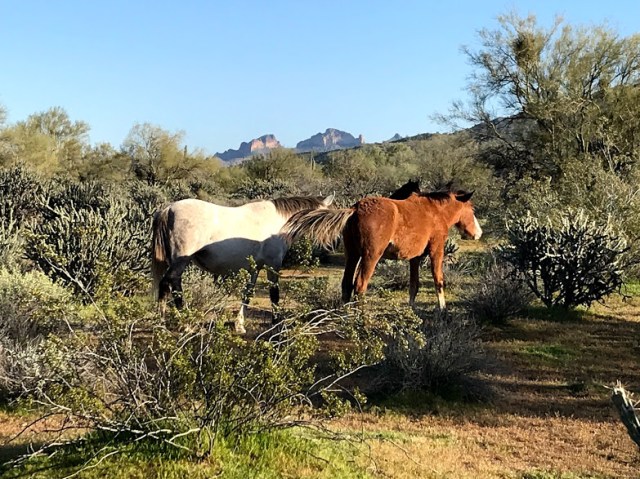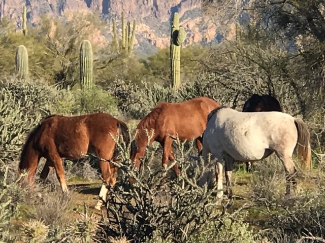 I have mentioned in past posts — whined, even — that while most people have been successfully seeing the wild horses that live in the Tonto Forest near Saguaro Lake Recreation Area north of us, the horses have remained elusive to Bill and me. It was particularly frustrating this year, because the rain and chilly winter has resulted in the horses being particularly healthy and active. We would hear about literally herds of horses putting on a show for the masses. But not for us.