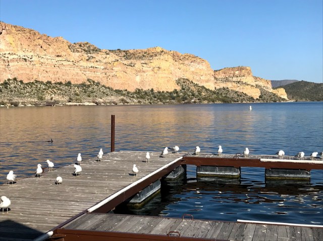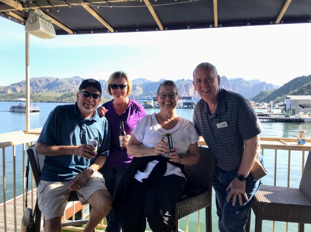 The Saguaro Lake marina has a boat dock that features gift items and, well, beer. The four of us enjoyed a cold one while we waited for the sun to make its way across the sky towards sunset…..